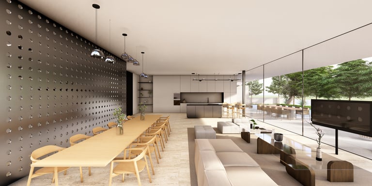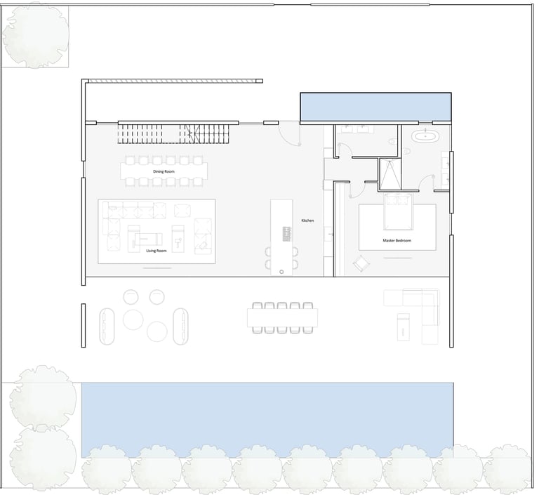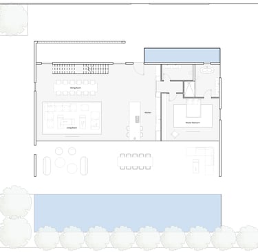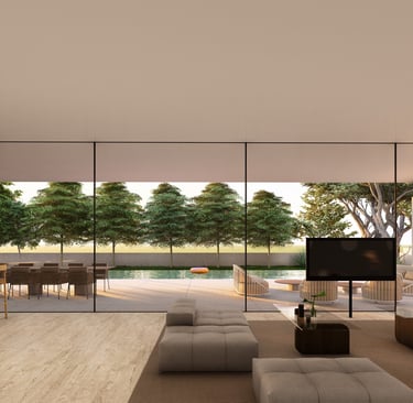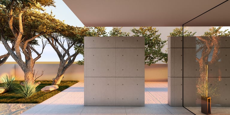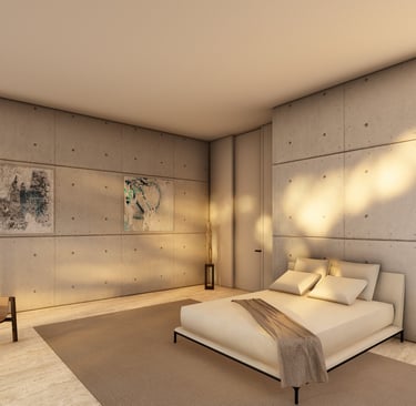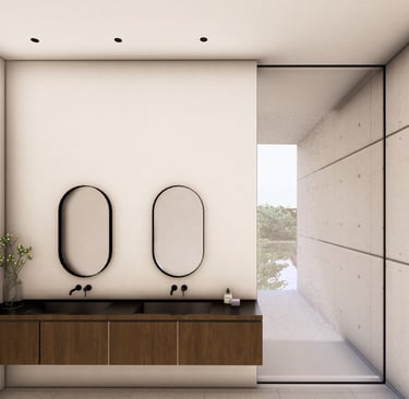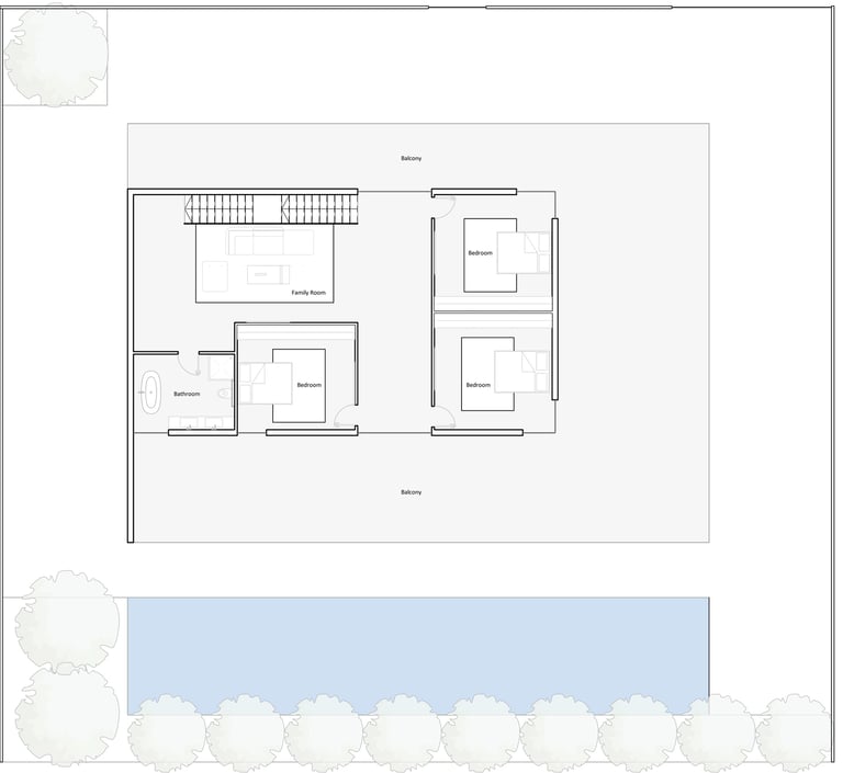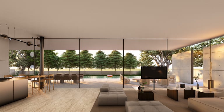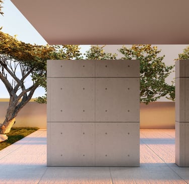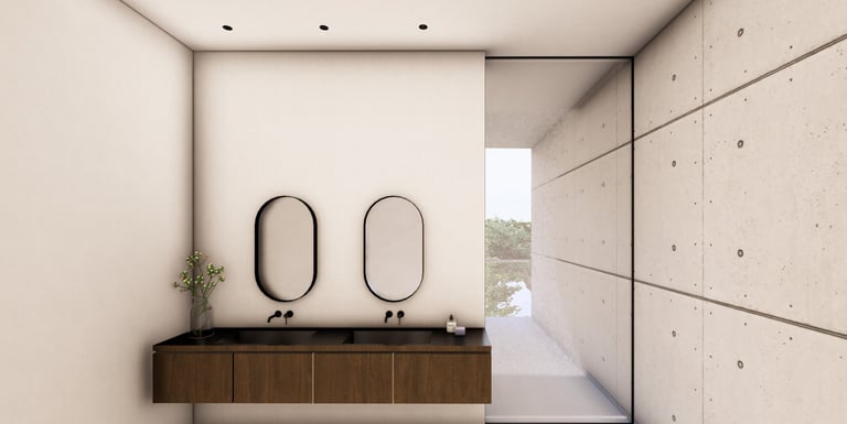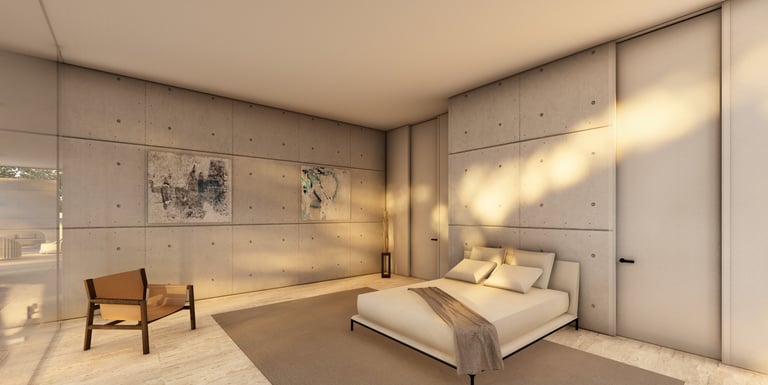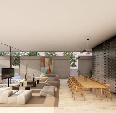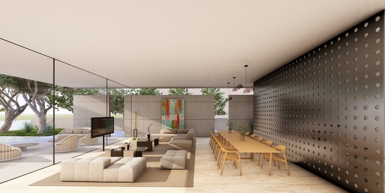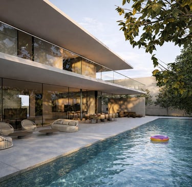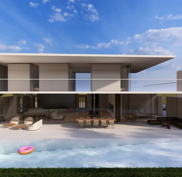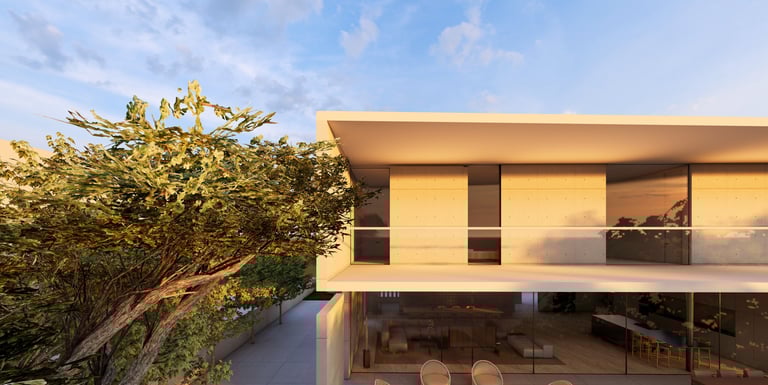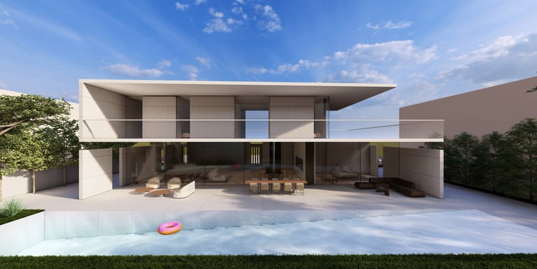 הצורתיות של הבית צמחה מתוך צורת האות S- קירות ותקרות מבטון חשוף בצורת S הם אלו שהכתיבו את חזיתות המבנה. המבנה בעל חזית פתוחה לגמרי לכיוון החצר והבריכה וחזית אטומה כלפי הרחוב. בטון חשוף בטפסנות ריבועית לקח חלק מרכזי בקירות הבית, בעוד אבן טרוורטין ברצפתו.