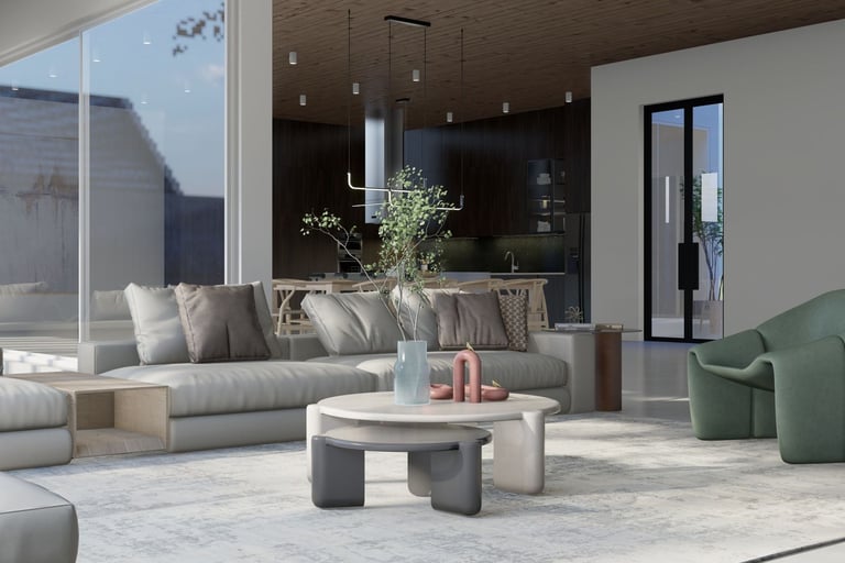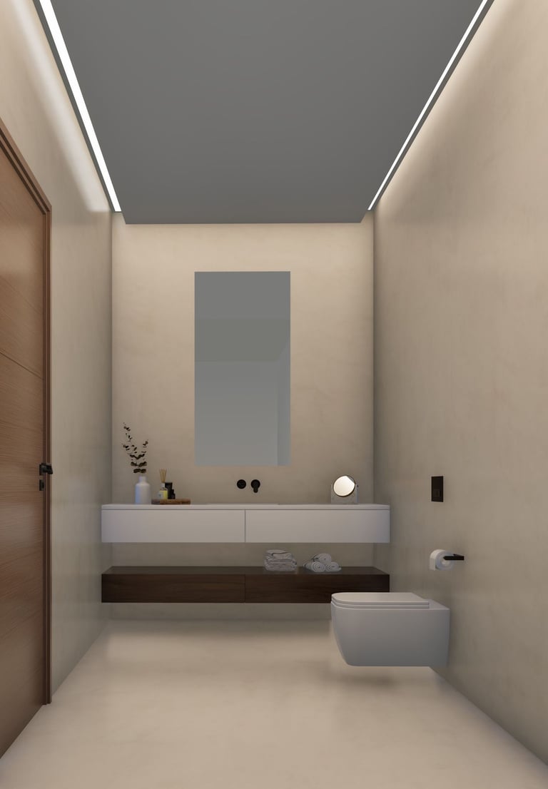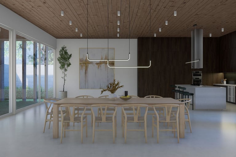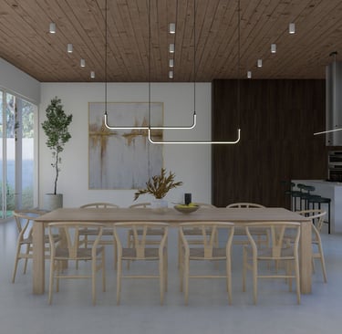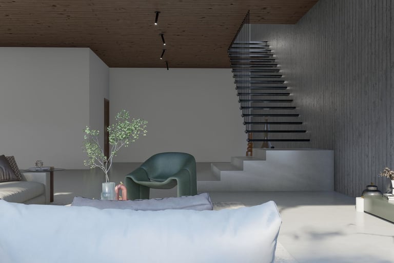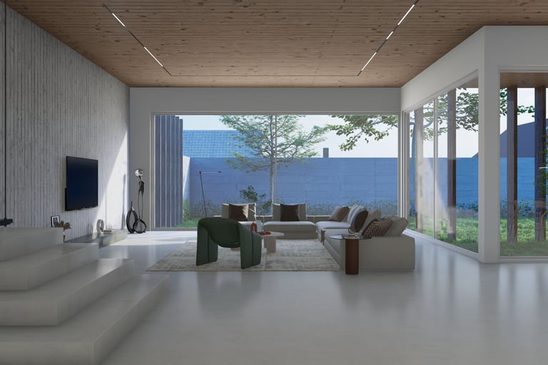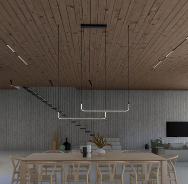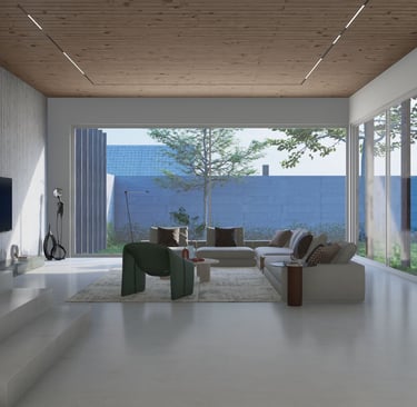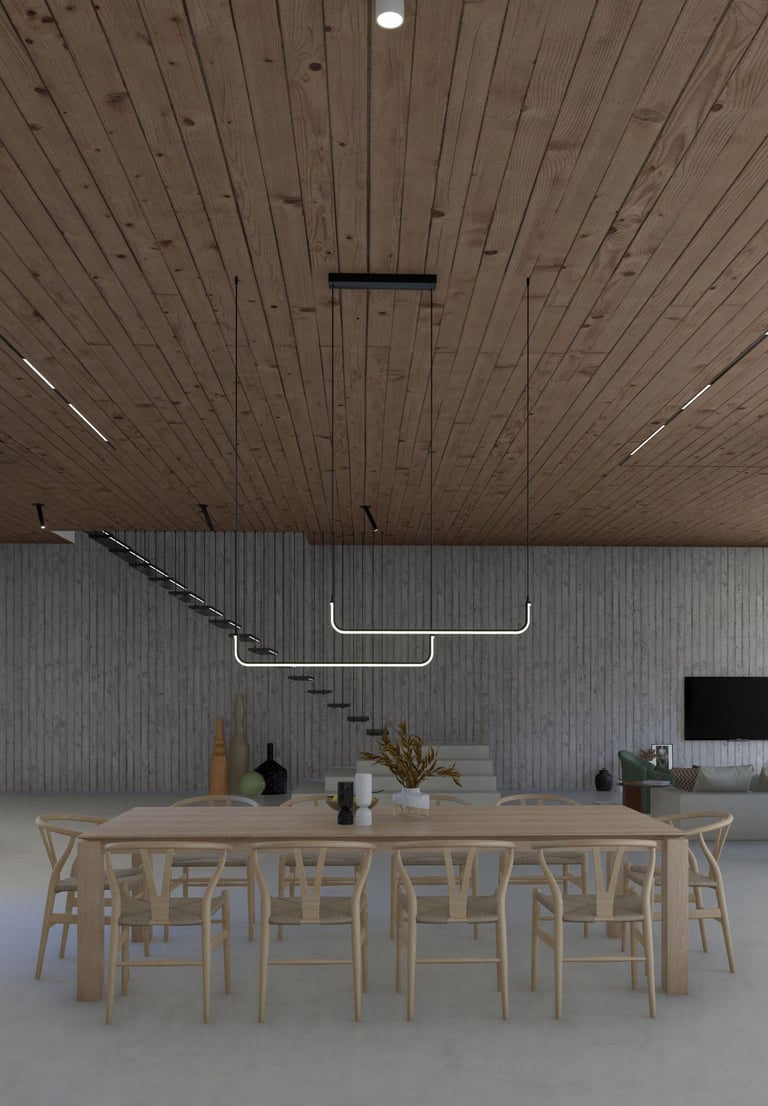 בית פרטי שעוצב למשפחה במרכז הארץ. תקרת עץ עוטפת את הבית מלמעלה ורצפת רזינה מלמטה, תוך שילוב של מדרגות קלות ונגרויות מעץ. עיצוב הבית הדגיש שימוש בחומרים טבעיים כמו בטון, אבן ועץ עם פתחים רחבים כלפי חוץ.
